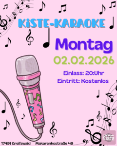 Lust auf Mitsingen und gute Laune? 🎤 Beim Kiste-Karaoke am Montag, 02.02.2026, kannst du ab 20 Uhr in der Kiste deine Lieblingssongs zum Besten geben. Der Eintritt ist kostenlos – schnapp dir das Mikro und hab Spaß! 🎶