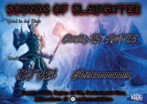 Kommt und lernt den Sound von Sounds of Slaughter kennen und lieben. Schnappt euch euer Bier und genießt einen Abend voller Metal in der Kiste.