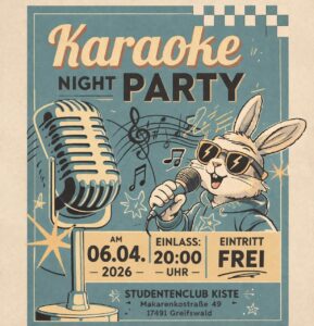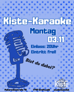 Am Montag, den 08. November, lädt der Studentenclub Kiste in Greifswald zum „Kiste-Karaoke“ in der Makarenkostraße 49 ein. Der Eintritt ist frei und alle Hobby-Sänger können ab 20 Uhr zeigen, was sie stimmlich drauf haben. Komm vorbei, genieße die lockere Atmosphäre und sing deine Lieblingslieder!
