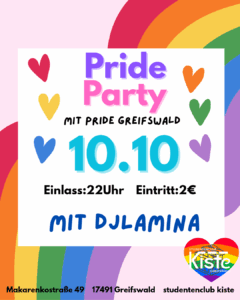 Hey Party People! Macht euch bereit für die Pride Party mit Pride Greifswald am 10. Oktober im Studentenclub Kiste (Makarenkostraße 49). Ab 22 Uhr könnt ihr für nur 2€ mit DJ Lamina feiern und die Nacht durchtanzen. Kommt vorbei und feiert mit uns eine bunte und unvergessliche Nacht!