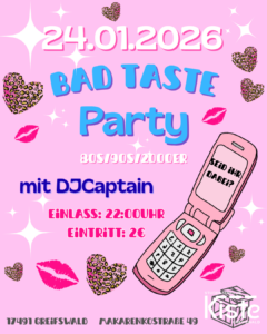 Zeit für Throwback-Vibes! 💖 Bei der Bad Taste Party am 24.01.2026 feiert ihr die größten Hits der 80er, 90er und 2000er mit DJ Captain in der Kiste. Einlass ist ab 22 Uhr, der Eintritt kostet 2 € – je schräger das Outfit, desto besser! 🕺✨