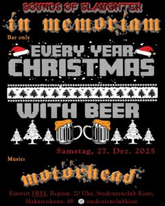 Ab 20 Uhr gibt’s im Studentenclub Kiste kaltes Bier, gute Gesellschaft und feinsten Motörhead-Sound auf die Ohren. Kein Schnickschnack, keine Besinnlichkeit – einfach ein Abend für alle, die Weihnachten lieber mit verzerrten Gitarren als mit Glockenklang verbringen.